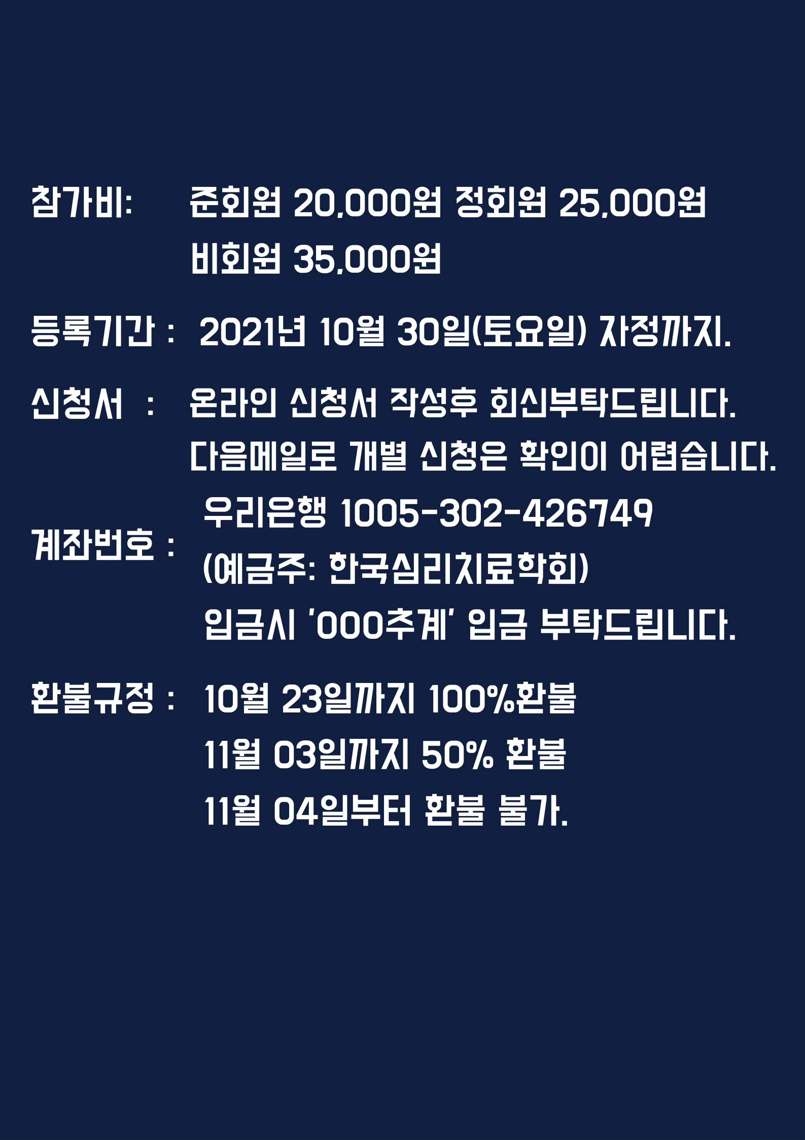 계좌번호: 우리은행 1005-302-426749 (예금주: 한국심리치료학회)